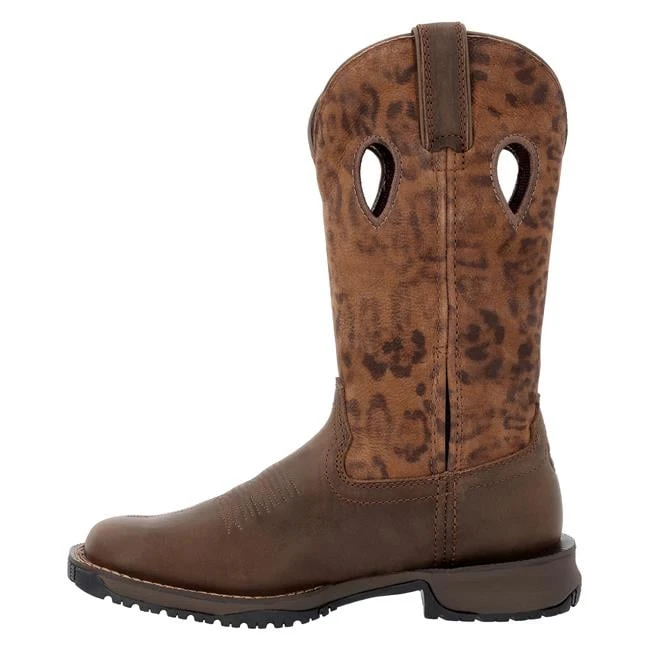 Introducing our first women’s exclusive western collection, the Rocky Rosemary Women’s Western Boot is designed to offer all-day comfort, safety, and stability. With a mix of fashion and functionality, this 12-inch brown and leopard full grain leather boot is packed with features built to withstand the job. A light and flexible construction, fiberglass shank, oil- & slip-resisting rubber outsole with EVA midsole, and an EnergyBed footbed all work together to keep you on your feet for longer. Add in an expansion fit seam for easy on and off after those long workdays. This square toe pull-on boot meets ASTM F2892 electrical hazard standard for soft toe work footwear.