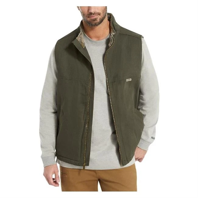 The Wolverine Upland Vest is made with a classic design and has the warmth you need to thrive in cold conditions. The outside of the vest is constructed with 100% cotton twill, and the inside is lined with warm, 100% polyester sherpa fleece. An internal chest pocket with a hook and loop closure protects small accessories, while two welt pockets on the front offer additional storage capabilities. The top of the collar features an internal wind flap with a self-fabric zipper for protection from the weather. Designed with a pigment print and enzyme washing for a clean appearance, this vest is a perfect layer for your cold weather gear.